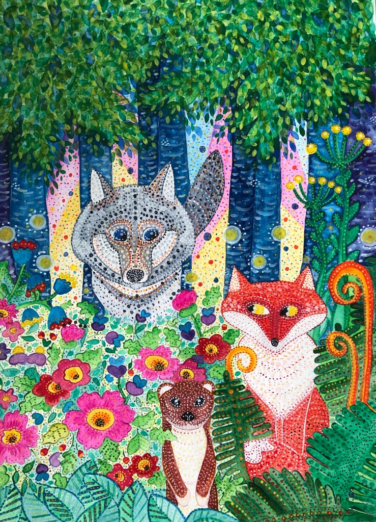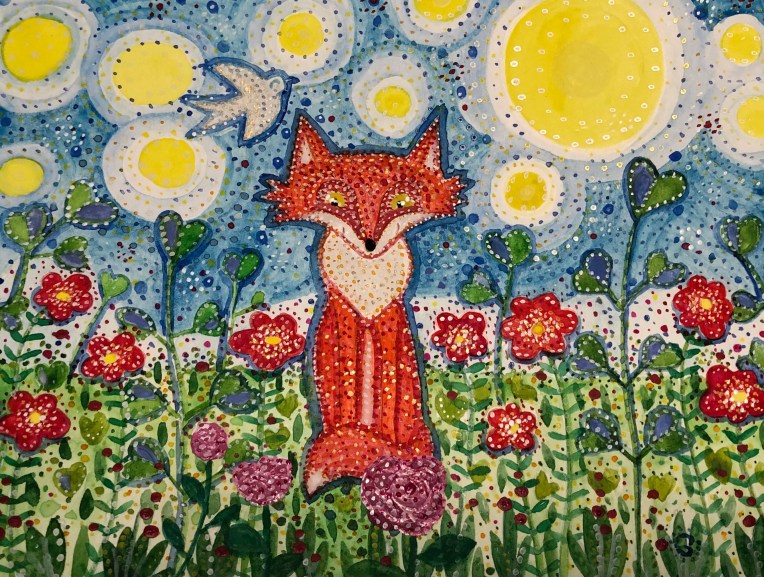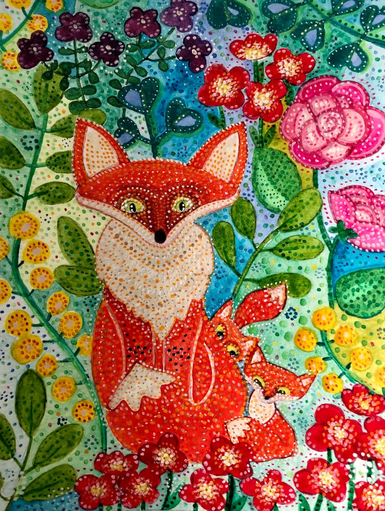 En début d’année, j’ai peint un renard que j’aime beaucoup et cette fois j’ai eu envie de peindre une renarde.