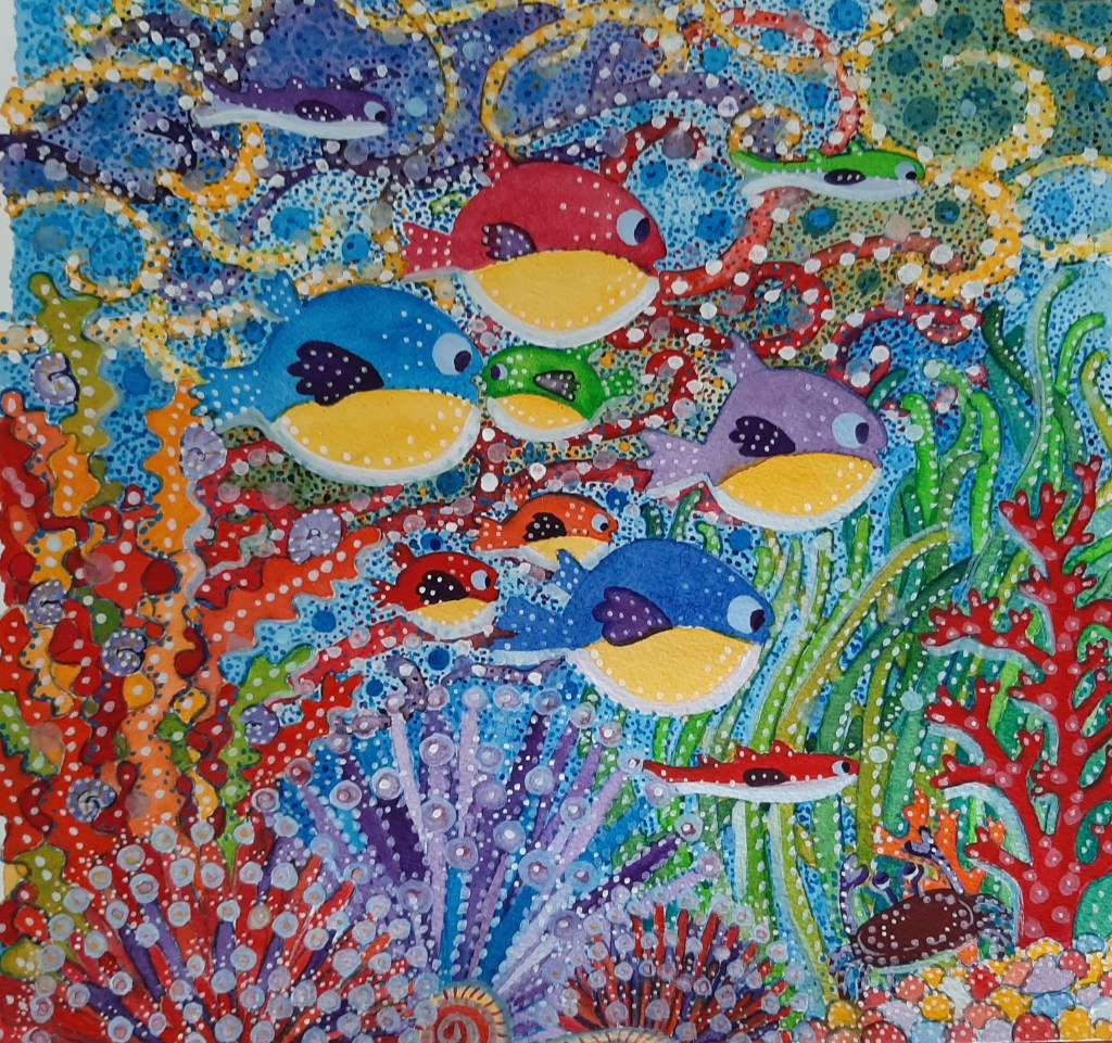 Une nouvelle aquarelle sur le thème marin. Pas d’oiseaux mais des poissons !