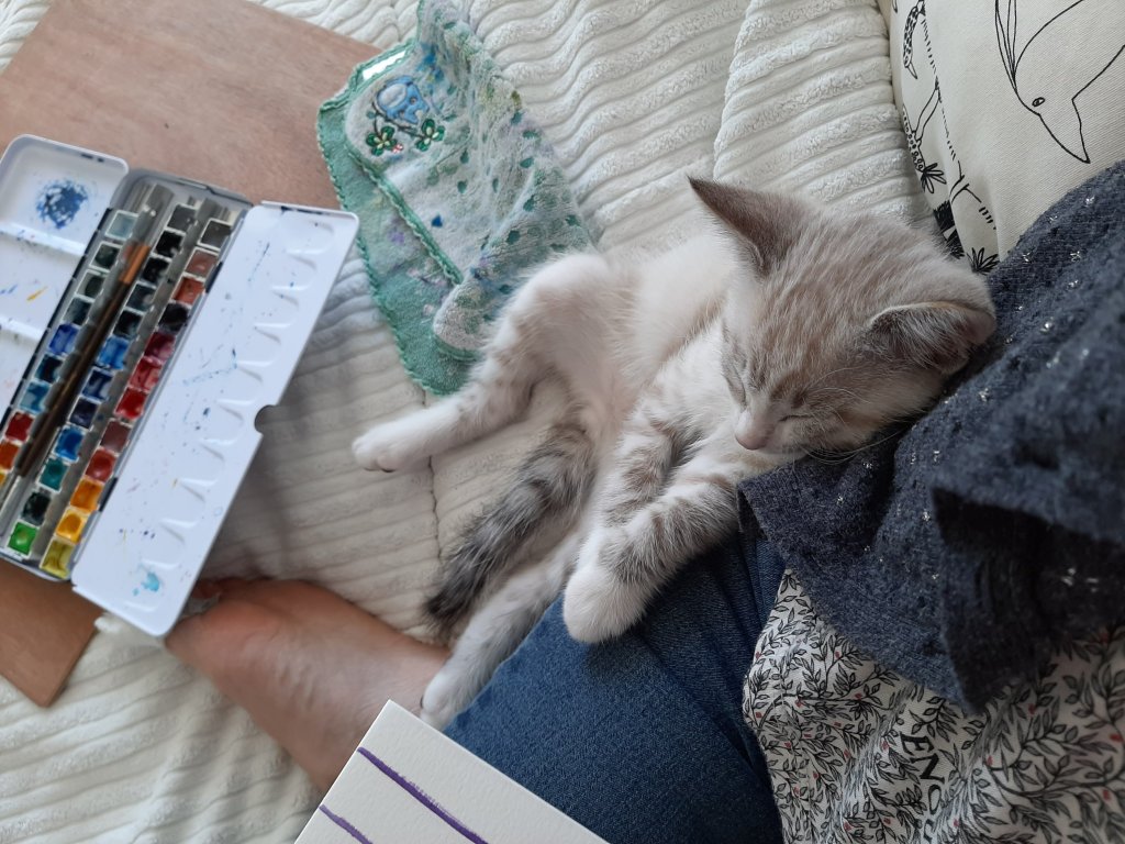 Mais, comme mon précédent chat, Mitsu aime aussi parfois dormir près de moi lorsque je peins ! 🥰