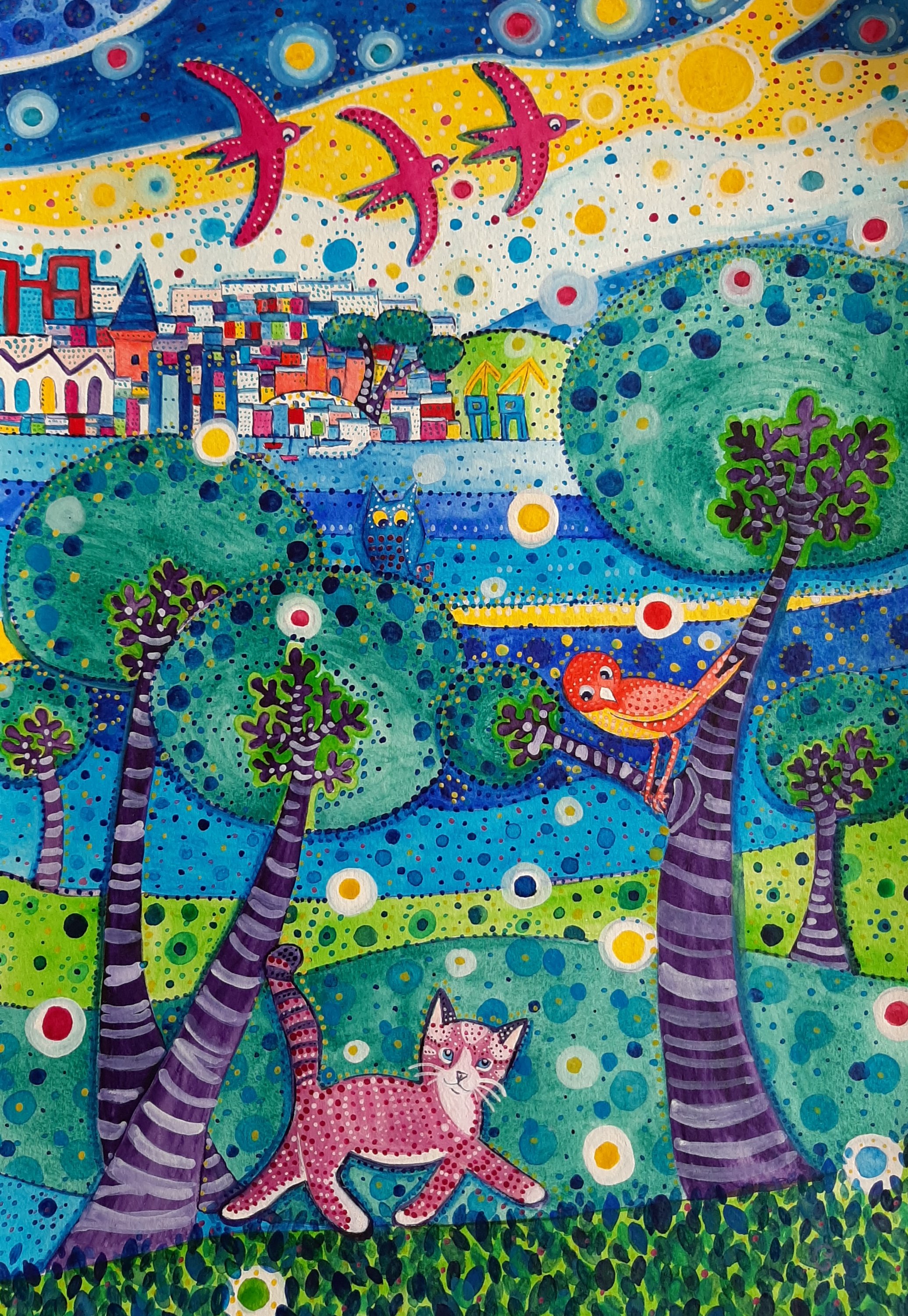 Il m’a donc fallu bien plus de temps que d’habitude pour peindre cette aquarelle… et rattraper des coups de pattes sur la peinture fraîche 😋.