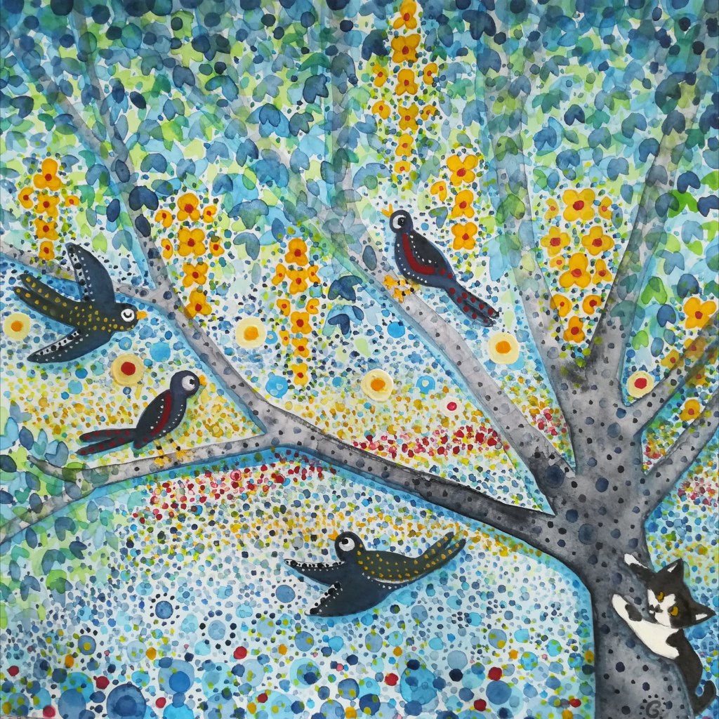 Dans notre jardin, le cytise commence à fleurir et les oiseaux aiment y aller, car il y a plein d’insectes. Moshi-Moshi surveille avec intérêt leurs allées et venues.. J’ai donc peint cette aquarelle en les regardant…