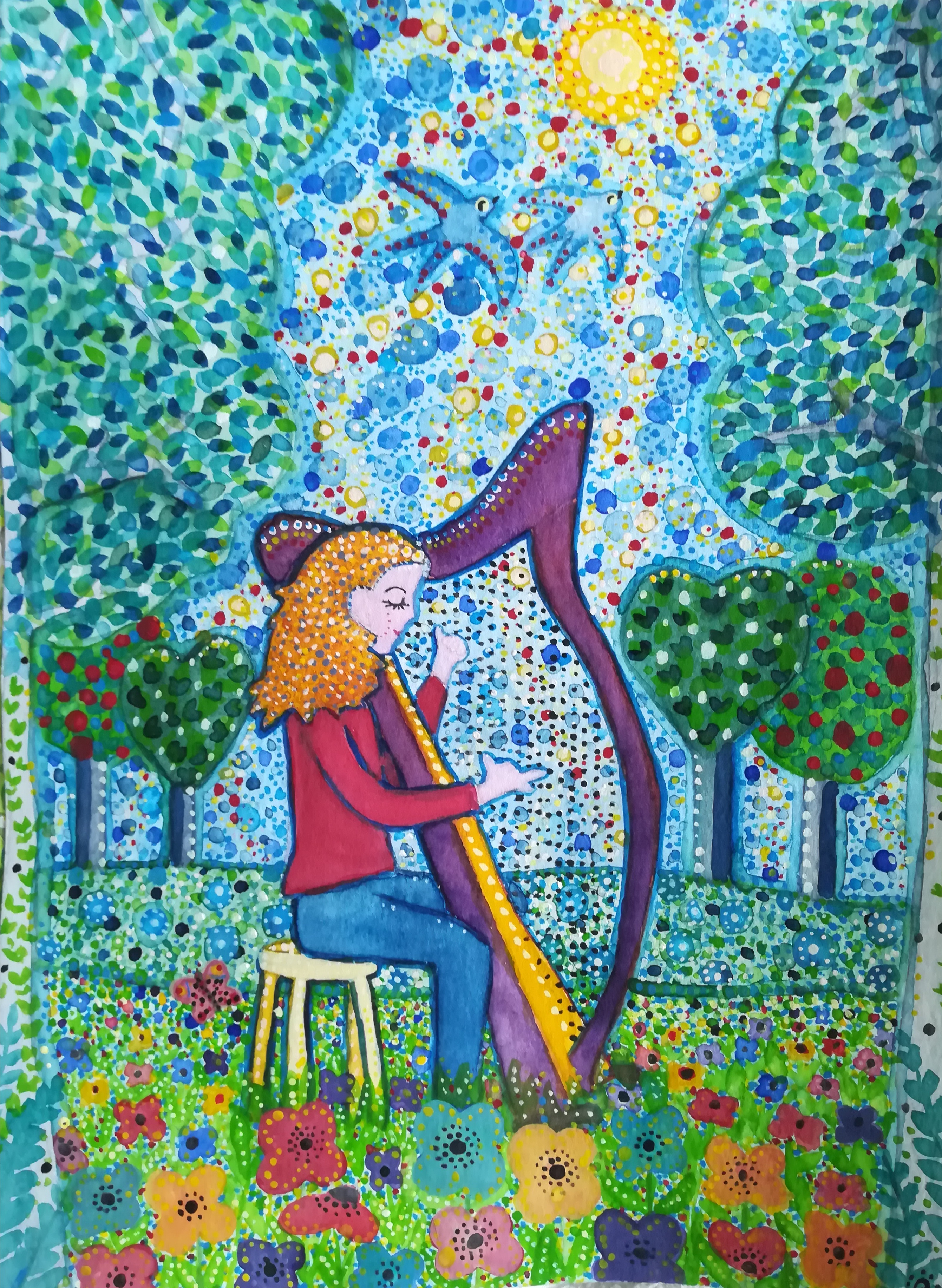 Voilà une aquarelle faite à la demande d’une jeune harpiste pour son prochain anniversaire.